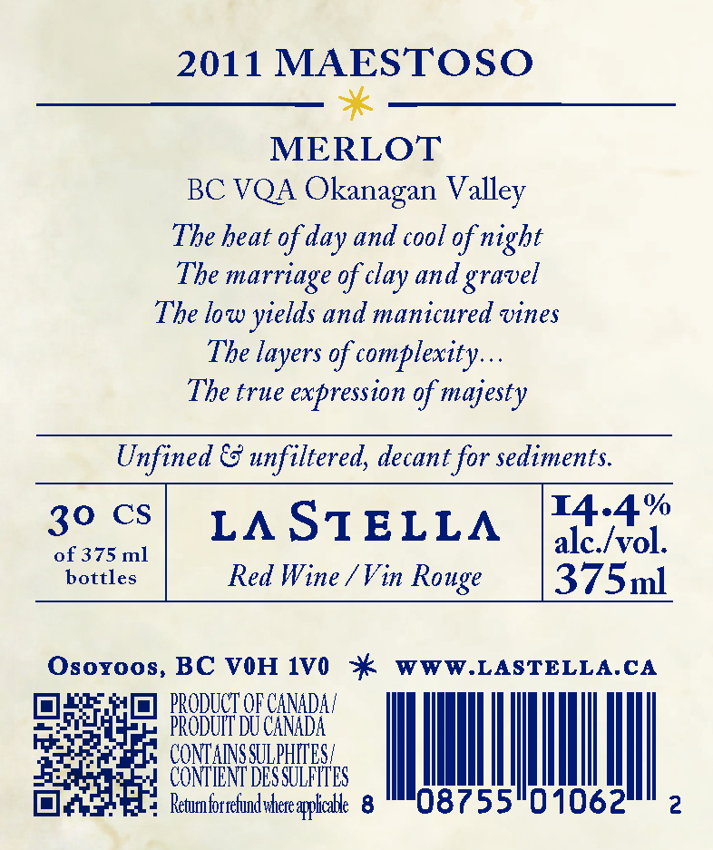 Maestoso (C$100) is the flagship wine and the jewel in the crown of the LaStella winery. It is produced as rich wine, full bodied and wanting to be enjoyed, but still have some structure and restraint. This wine is aged for 18 months in both French and Slavonian Oak barrels and puncheons (500L and 1000L). 21% new oak, 43% second fill, and the balance in neutral oak. The grapes come from their Lumeno Vineyard and a pinch from La Feuille D’Or vineyard. It is 100% Merlot, which allows the wine to be rounder and more fruit forward, but still quite powerful. I have noted in the past that the Merlots in the BC Okanagan, and in Washington State, seem to be bigger than Cabernet Sauvignon. Everything about this wine shows it’s qualtiy.